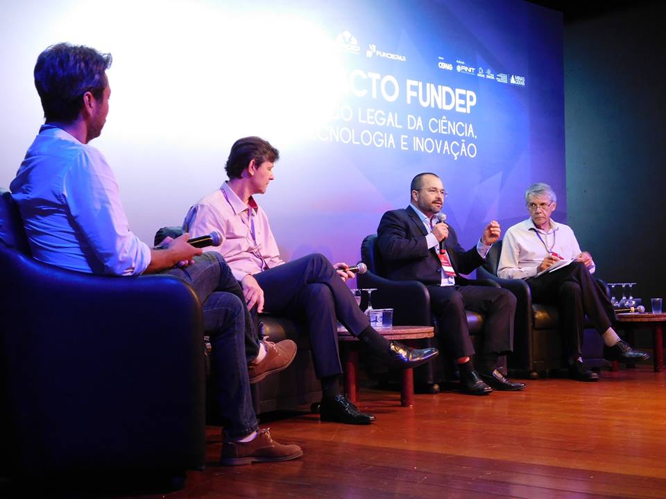 Painelistas: Bruno Teatini, assessor Jurídico da Fundep; prof. Evaldo Vilela, presidente da Fundação de Amparo à Pesquisa de Minas Gerias (Fapemig); Regina Mattos, procuradora Fapemig; e a Juliana Crepalde, coordenadora geral da Coordenadoria de Transferência e Inovação Tecnológica (CTIT) da UFMG.