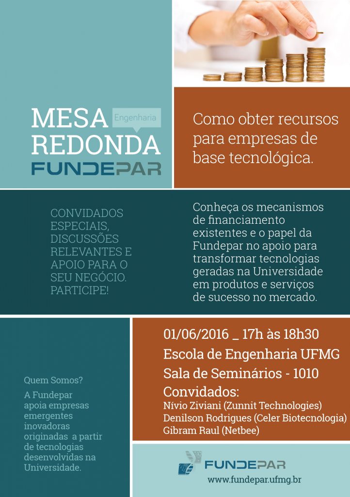 Na próxima quarta-feira (1º de junho), será realizada, na escola de Engenharia da UFMG, a Mesa Redonda Fundepar. Dirigida a pesquisadores e alunos que empreendem ou têm a intenção de empreender tecnologias desenvolvidas na Universidade, a iniciativa visa apresentar e discutir os principais mecanismos atuais de financiamento a empresas de base tecnológica, com ênfase nas características do capitalsemente.