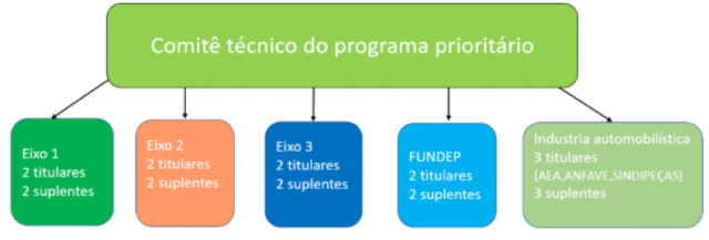 A composição do Comitê Técnico foi estabelecida por meio do Anexo I do instrumento jurídico que formaliza a relação da Fundep com o Ministério da Economia. O Comitê é formado por pesquisadores dos centros de pesquisa nacionais atuantes nos eixos de pesquisas e cujas competências técnicas são reconhecidas, representantes técnicos da indústria automobilística nacional e representantes da coordenadora do programa. No documento consta a seguinte diretriz: