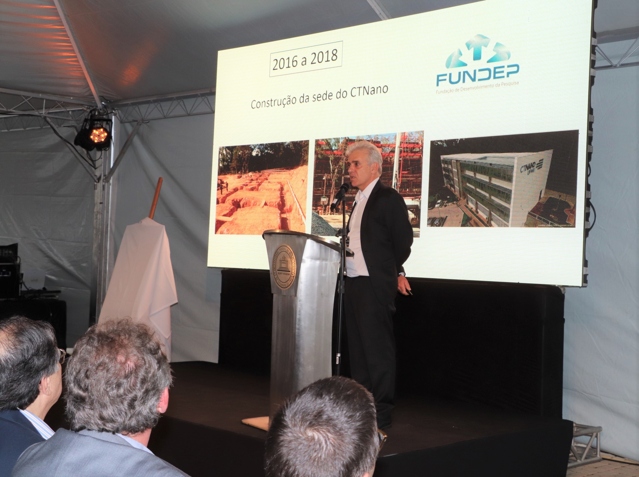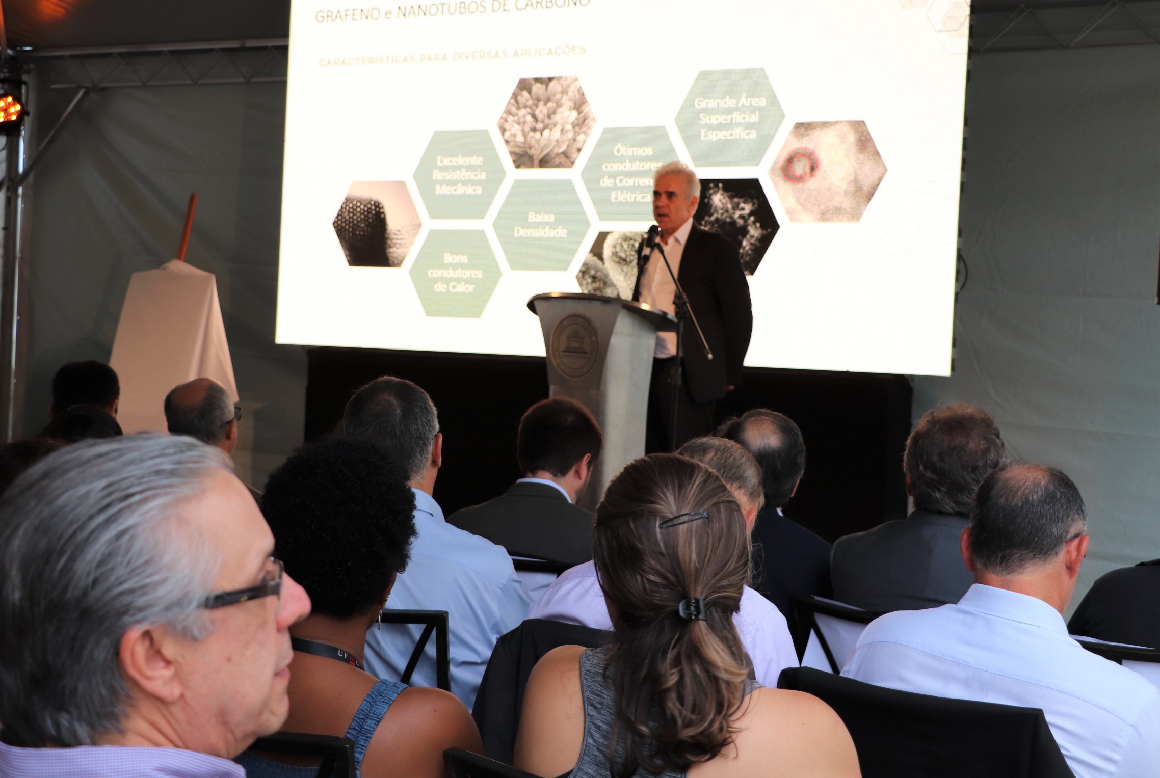 Ao abrir a cerimônia, o coordenador geral do CTNano/UFMG, professor do Departamento de Física da UFMG, Marcos Pimenta, explicou o que são explicou o que são os nanotubos de carbono e o grafeno, falou da origem das pesquisas em nanomateriais e da história do CTNano. Segundo ele, o Centro, que trabalha na interface entre a academia e o setor industrial com apoio do setor público, captou, até o momento, cerca de R$ 46 milhões, dos quais, 52% vieram do setor privado (que, nesse arranjo, inclui a Petrobras), 45% de fontes governamentais da esfera federal e 3% do governo estadual. “Está na hora de aumentar a participação do Governo do Estado no financiamento desse Centro”, afirmou Pimenta. A Fundep realiza a gestão dos projetos do CTNano e participou ativamente da execução da obra do prédio. “Apoiando o desenvolvimento dos projetos, a Fundep atua como agente conectora no ecossistema de ensino, pesquisa e inovação, contribuindo para a interface entre universidade, governo, iniciativa privada e sociedade”, conta o professor Alfredo Gontijo de Oliveira.