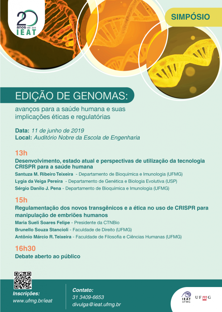 Organizadora do evento, a professora Santuza Maria Ribeiro Teixeira, do Departamento de Bioquímica e Imunologia da UFMG e residente do IEAT, destaca que “se espera que as discussões geradas no simpósio possam disseminar o conhecimento sobre essa nova e promissora tecnologia entre a comunidade da UFMG, mostrando os benefícios que ela pode trazer para a sociedade e ainda contribuir para o debate sobre questões éticas e legais que devem, obrigatoriamente, estar associados a sua utilização”. No evento estão previstas discussões com especialistas de diferentes áreas do conhecimento, não somente da área Biomédica, mas também da Filosofia e do Direito.